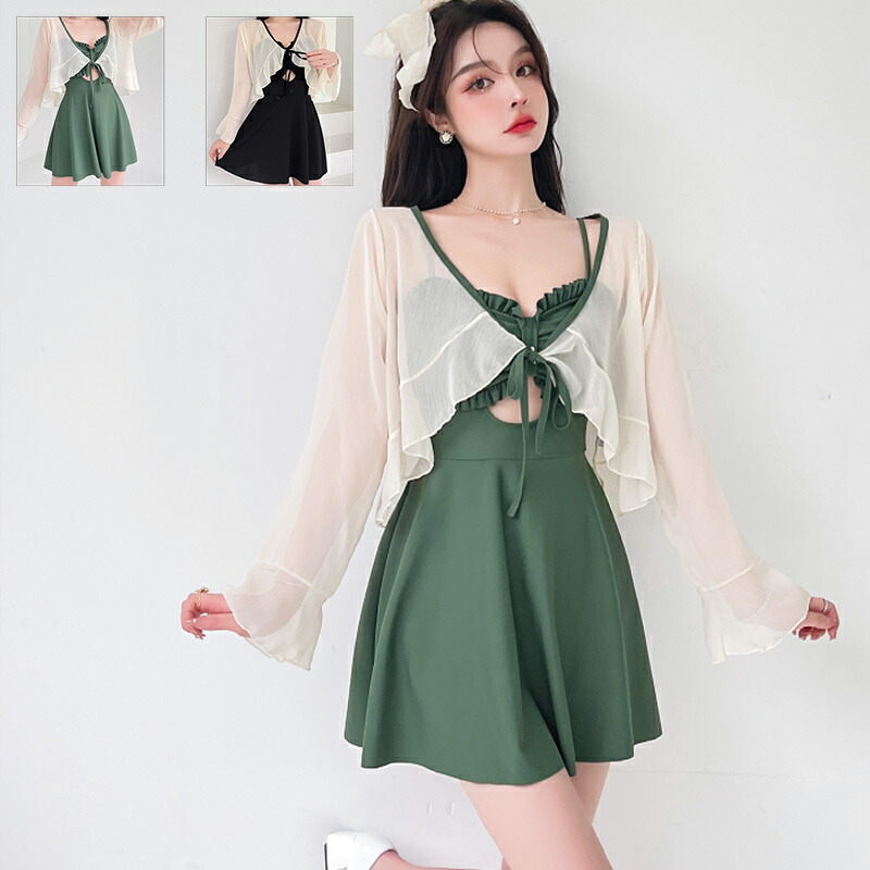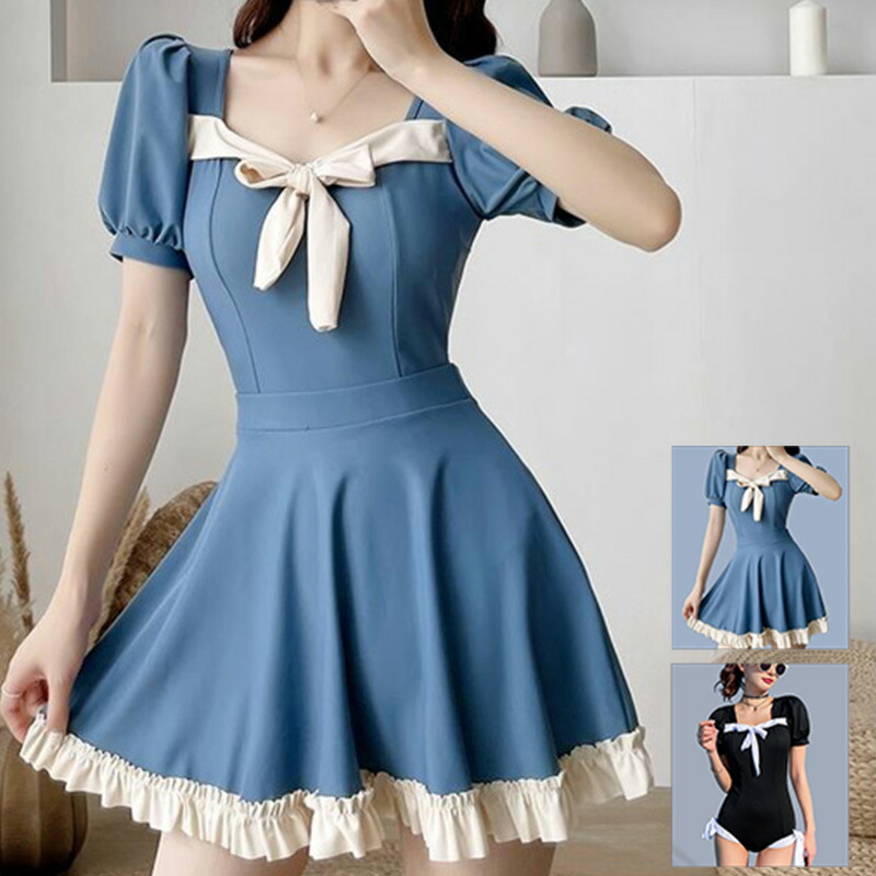 ワンピース水着 2点セット 体型カバー水着 レディース オールインワン 水着 トップス かわいい 無地 おしゃれ 大人 露出控えめ ネック ノンワイヤー リボン 女の子