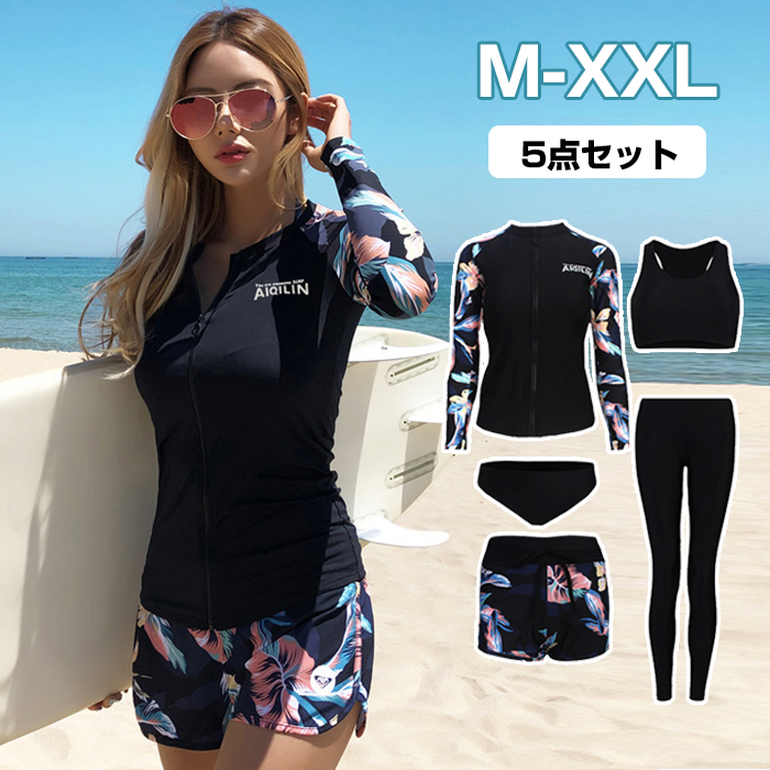 フィットネス 水着 レディース 体型カバー 水着 レディース ラッシュガード 5点セット 長袖 前開き 上下セット セパレート 水着 露出控えめ UVカット タンキニ ショートパンツ レギンス 女子
