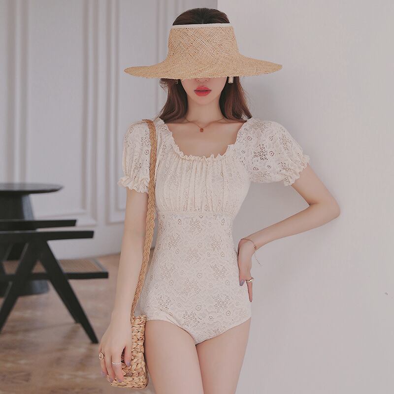 水着 ビキニ スイムウェア ワンピース水着 セクシービキニ 体系カバー水着 ワンピース 体系カバー 半袖 リボン レース 刺繍 ハイウエスト 胸元 谷間 谷間魅せ 盛れる かわいい 大人可愛い きれい