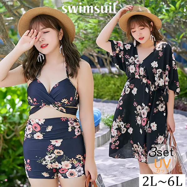 水着 レディース 高校生 中学生 10代 20代 ビキニ 体型カバー 3点セット 大きいサイズ タンキニ 黒 ブラック 4763