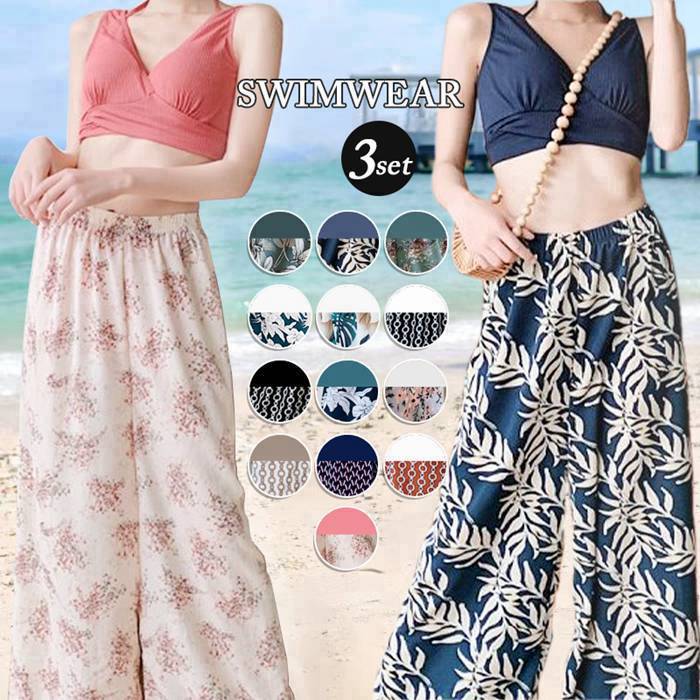 水着 レディース 体型カバー 水着 タンキニ Vネック ビキニ ワイドパンツ 3点セット 20代 30代 40代 ママ水着