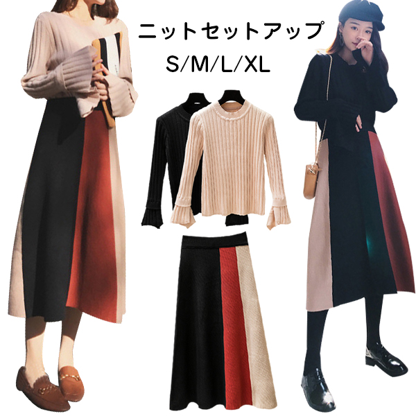 フレア袖のニットセーターと切り替え風ロングスカートの2点セット レディースファッション スーツ セットアップ スカートスーツ