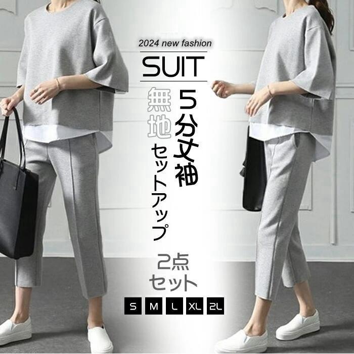 2点セット セットアップ レディース トップス Tシャツ パンツ ロングパンツ ボトムズ 春夏 無地 ゆったり 上下セット 体型カバー オフィス レイヤード風 OL きれいめ 着痩せ