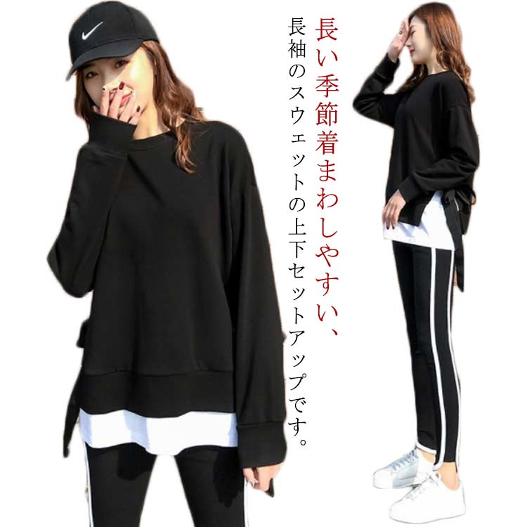 セットアップ レディース スウェット ジョガーパンツ ジャージ スポーツウェア プルオーバー 部屋着 ラウンジウェア ロング 長袖 ラウンドネック 上下 セット 2点 サイドライン シンプル