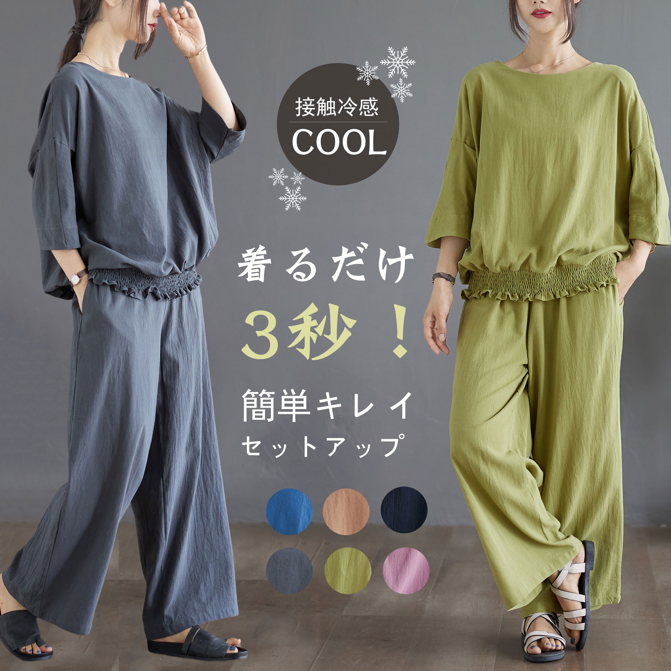 ひんやり涼しい接触冷感機能がセットアップで登場 レディース セットアップ 涼感 リラックス 体形カバー パンツ ラフ 楽ちん ゆったり ワンマイル イージーパンツ ルームウェア きれい