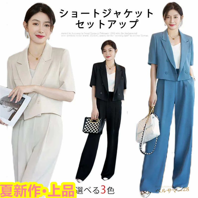 ショートジャケット 上下セット テーラードジャケット ワイドスラックスパンツ 無地レディースファッション スーツ セットアップ パンツスーツ