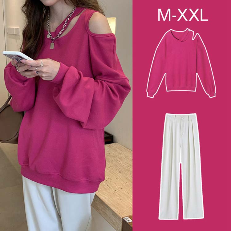 セットアップ レディース 春秋冬 カジュアル 大きいサイズ おしゃれ パーカー レディース 秋 大きいめ おしゃれ 薄手 片肩出し ピンク ワイドパンツ ホワイト 白 きれいめ