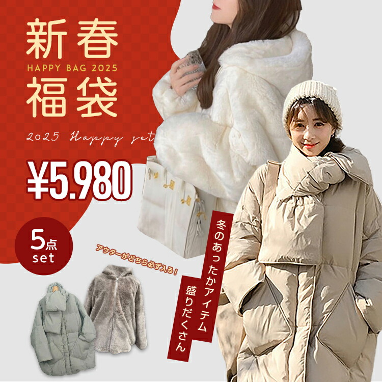 2025年 5点入り 福袋 SNS話題のアウターがどちらか入る アウター1点 裏起毛トップス1点、ニット1点、裏起毛ボトムス1点、ルームスリッパ1点の計5点詰め込み 豪華福袋 裏起毛 ふわふわエコファ