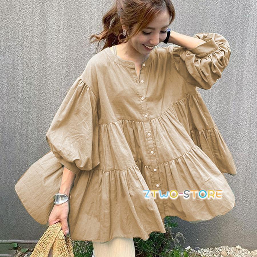 ブラウス レディース トップス ティアード ロング丈ノーカラー チュニック ぽわん袖 ボリューム袖 バルーン袖