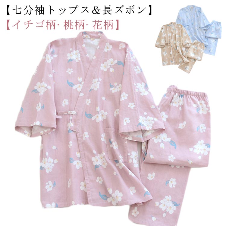 夏 パジャマ 上下セット 甚平 前開き 七分袖 ロングパンツ ポケット付き 可愛い おしゃれ 総柄レディースファッション 和服 浴衣セット