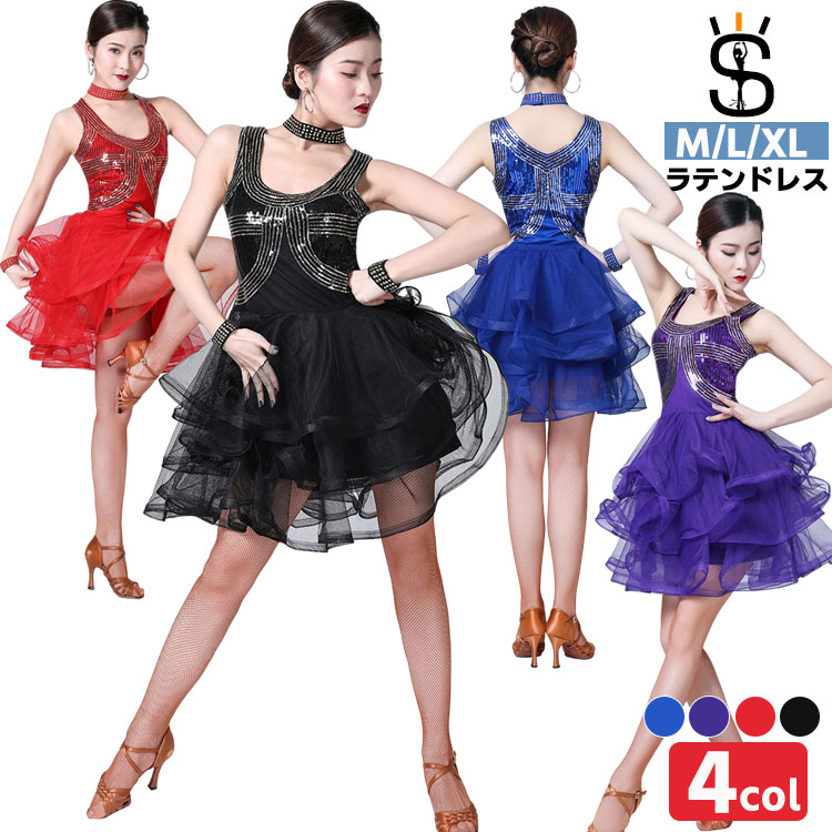全4色 高級感 上品 立体感があるラテンドレス スパンコール ダンス衣装 ダンス 衣装 ワンピース ドレス レディース用社交ダンス 衣装トップス レッド ブラック 赤 黒 パープル ブルー