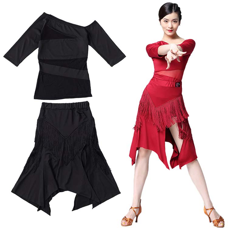 カラオケ 舞台 演奏会 発表会ドレス 社交ダンスドレス 大人上下セットアップ ストレッチ練習レッスン着 フリンジ ラテンダンス衣装 チャチャデモドレス 七分袖ブラウス
