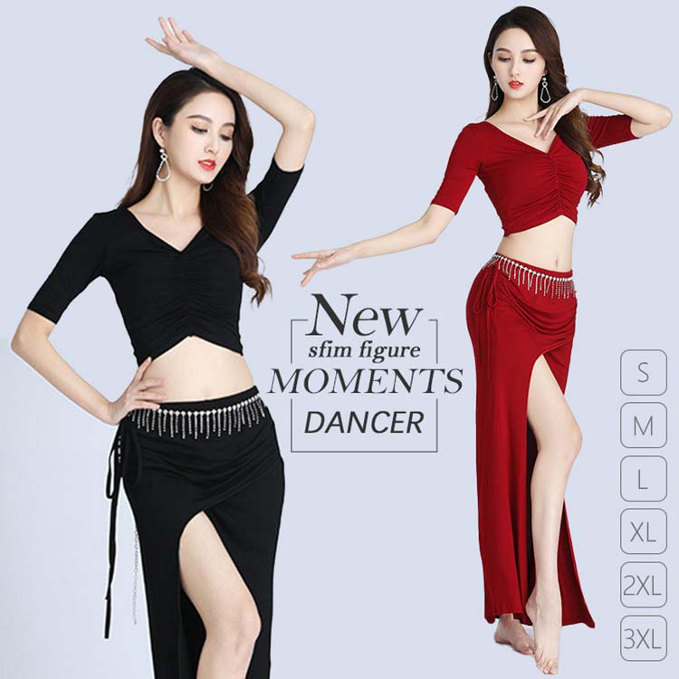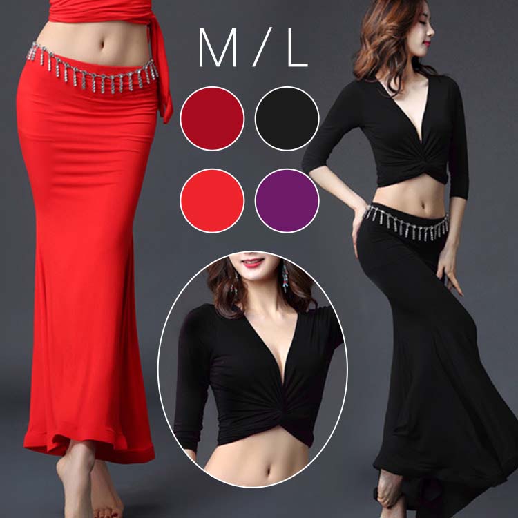 ベリーダンス 衣装 セットアップ 社交ダンス 練習着 レッスンウェア 2点上下セット スリットスカート シースルー ダンスウェア セクシー 半袖トップス+ロングスカート 女性 大人