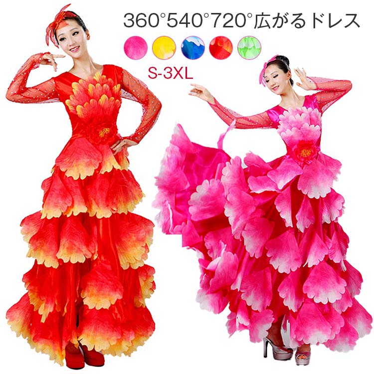 ボタン花びら超豪華ステージダンス衣装 民族舞踊 舞台演出ロングドレス モダンドレス 合唱団社交ダンス衣装 イベント撮影演出服 ワルツ裾ワタリ360°540°720°選択可 5色
