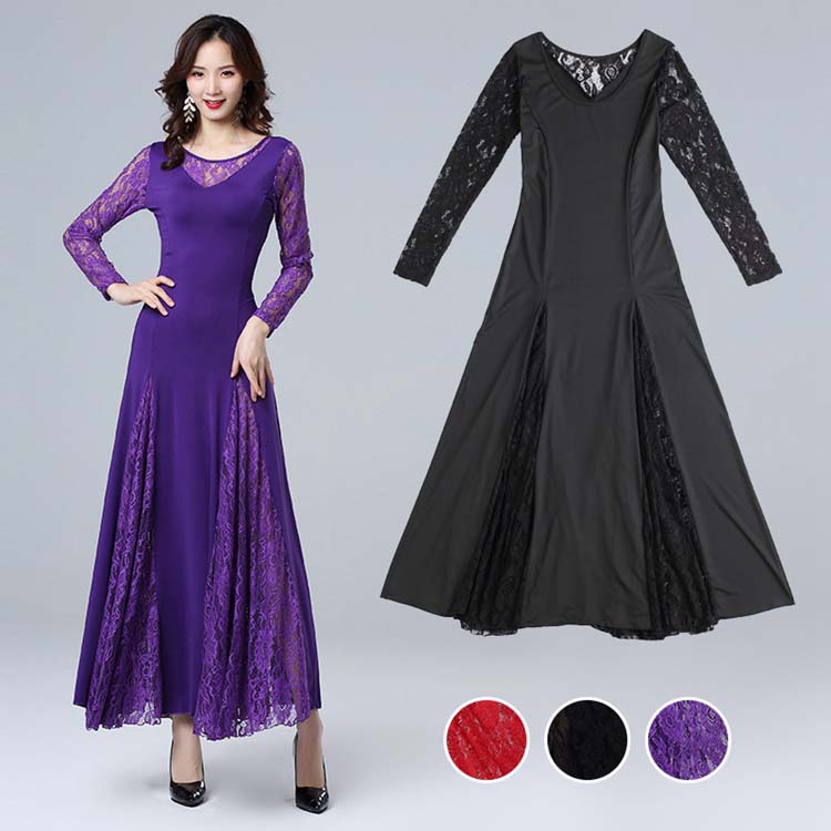 社交ダンス練習着 ロングワンピース 社交ダンス衣装 ワンピース レース切替ミモレモダンワルツドレス レッスン着 3COLOR ストレッチ モダンドレス 長袖 広がるデモドレス