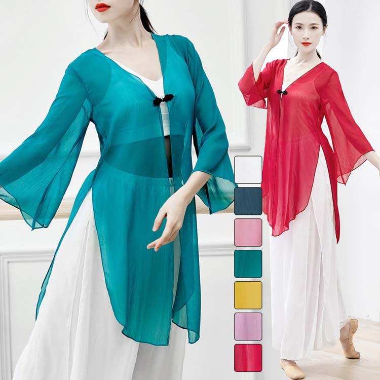 トランペットスリーブ 飄逸 ミドル丈羽織 紫 中華ダンス衣装 オリエンタル 古典舞踊 黄 ラッパ袖 レッスン着 ピンク 青 中華舞台衣装 練習着 カラフル ロングブラウス レディース