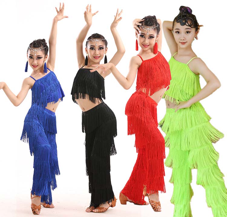 緑 レッスンウェア ジュニア社交ダンス衣装 上下2点セット 黒 フリンジトップス 赤 女の子 ブルー ストレッチ 110-170 舞台ステージ衣装 子供ラテンダンス衣装 セット ダンス