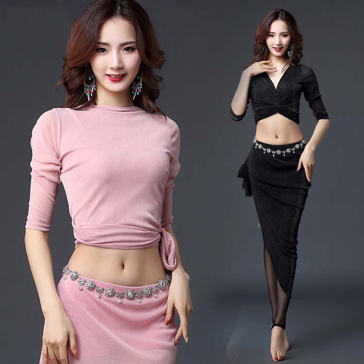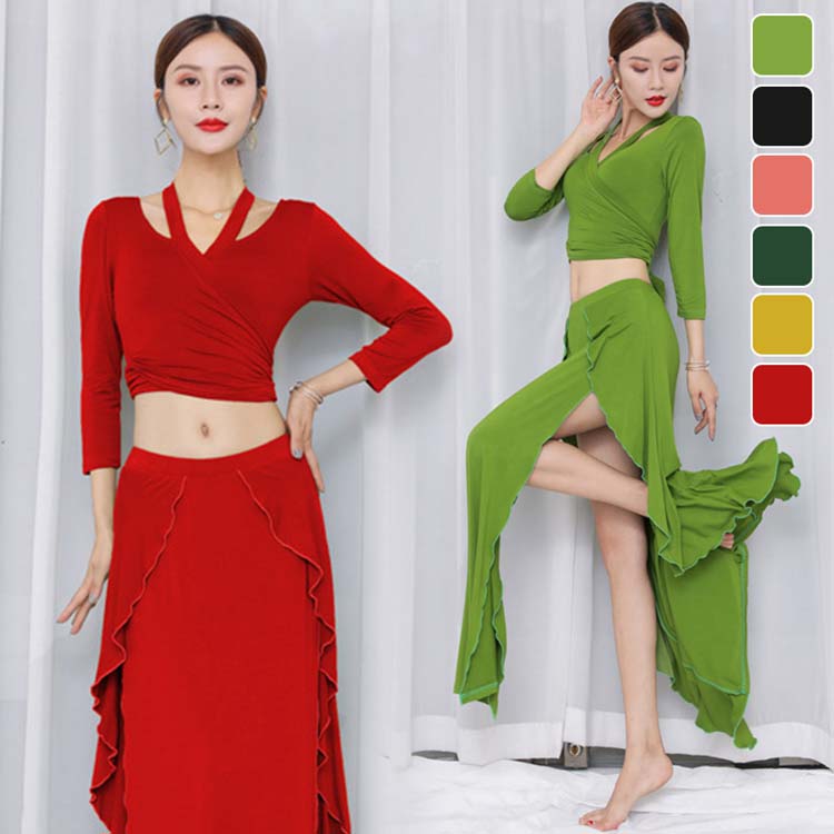 ベリーダンス レッスン着 セットアップ 衣装セット ベリーダンス衣装 長袖 トップス ロング丈 スカート 無地 セクシー フリル 練習服 着痩せ 六色選べる 春夏秋冬 前クロス