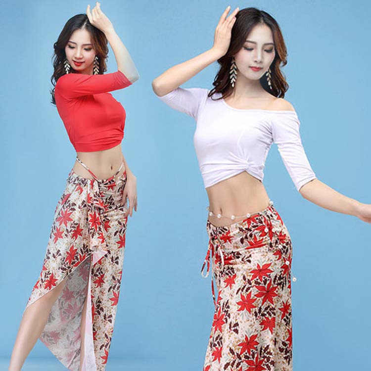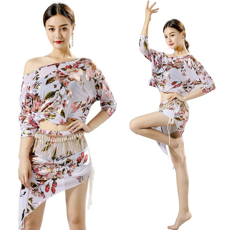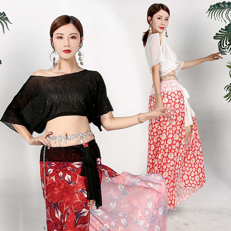 ベリーダンス 衣装 レッスン着2点セット 練習着 レディース社交ダンス衣装 花柄総柄スカーフ ゆったり トップス 半袖 Tシャツ 上下セット スカート セクシー ダンス衣装 大人気