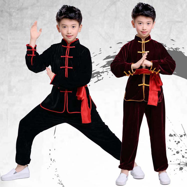 子供太極拳ウエア 春秋冬 中華服 カンフー武術気功衣装上下二点セット 民国風唐装漢服 ステージダンス衣装 男の子女の子舞台演出服 ベルベット素材長袖太極拳服上下セット