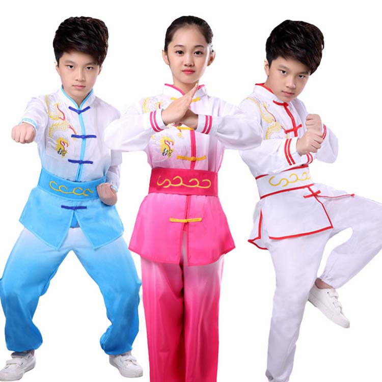 民国風唐装漢服 子供舞台ステージ衣装 110-160 男の子 カンフー武術 中華コスプレ衣装 キッズジュニア中国風武術服 気功上下二点セット 舞台演出服 龍刺繍子供太極拳ウエア