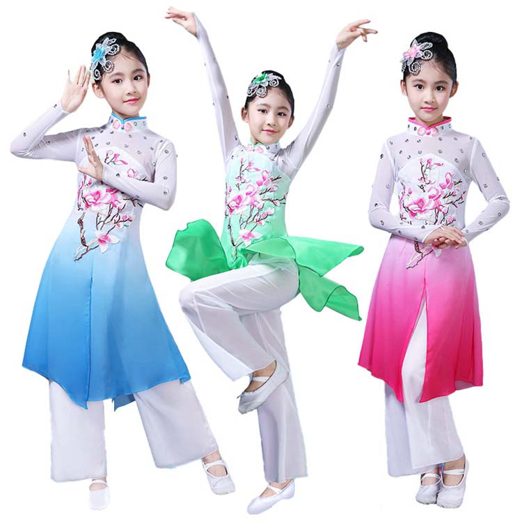 ジュニア 中華風ダンスウエア 緑 女の子 ブルー 二点セット 発表会 ピンク 舞台ステージ衣装 チャイナダンス衣装 花刺しゅう 中華風モダンドレス 子供古典ダンス衣装