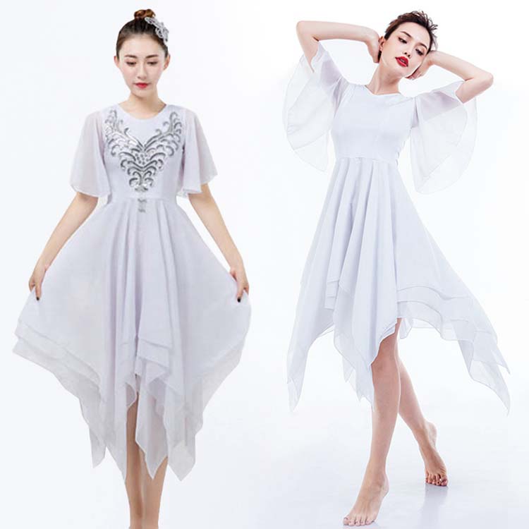 ワルツ 白 ミモレ丈 練習着 ラテン ダンスレッスン着 ワンピース 半袖 バレエ エレガント 大人 無地 レディース社交ダンス衣装 スパンコール飾り 演出服 古典ダンス衣装 裾フリル