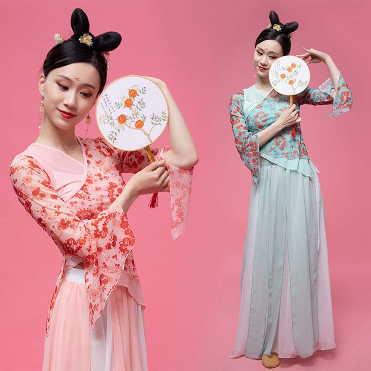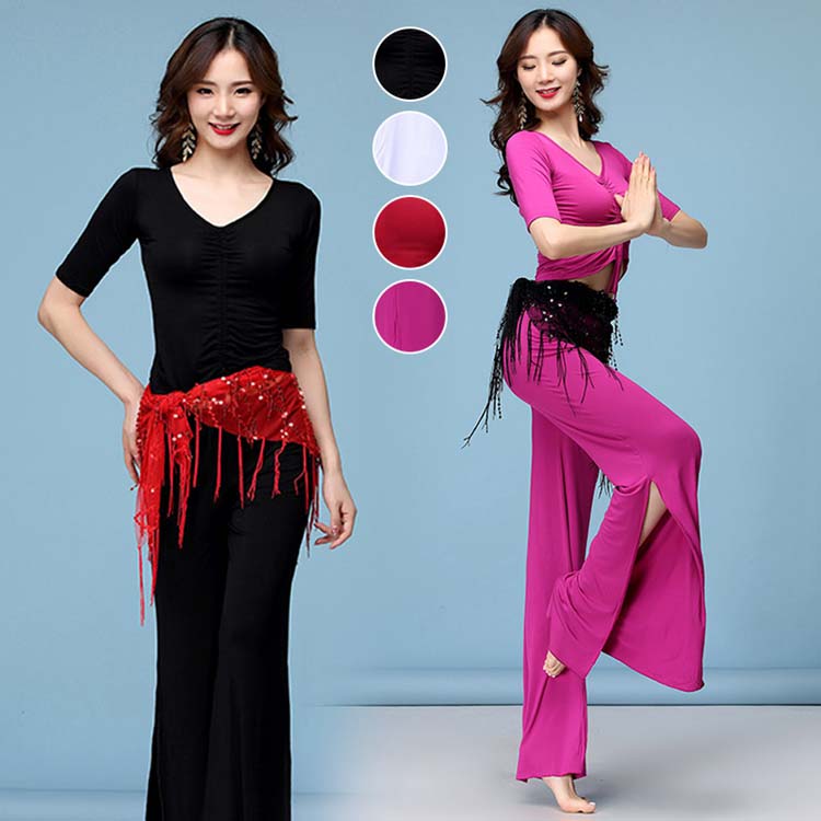 バレエ 4色 ヨガウエア上下二点セット スリットパンツ 五分袖ブラウス+ロングワイドパンツ 古典舞踊ダンス衣装 レディースダンス衣装 ラテン 練習着 太極拳ウエア
