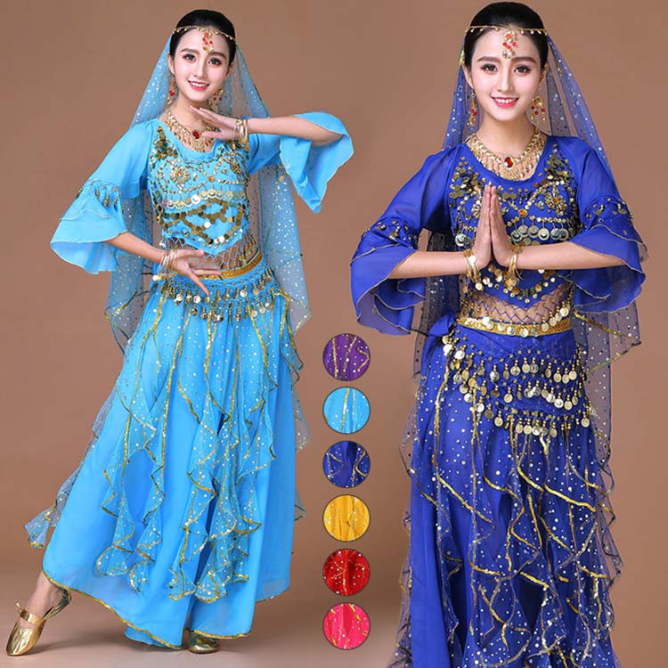 スカーフも対応可 6色 レディース舞台ダンスウエア ブラウス+スカート 上下セット コスプレ 大人ベリーダンス衣装 リボン可愛い舞台ステージ服 ベール スパンコールきらきら社交