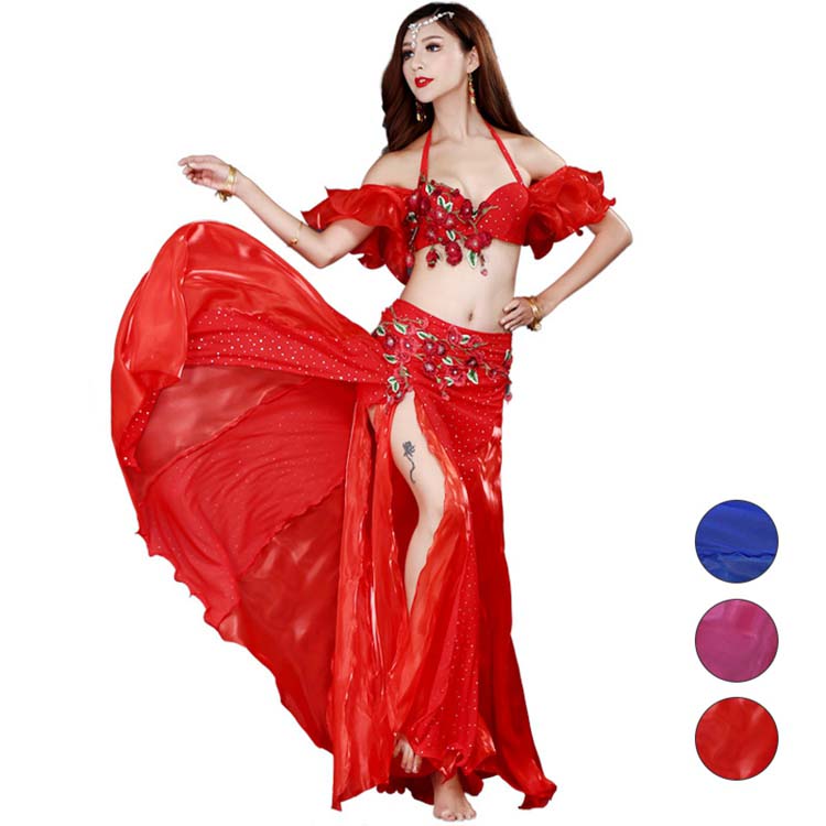 舞台ステージ服 上下衣装セット+スカーフ 光沢 ブラジャー+スリット入スカート スパンコール豪華社交ダンス衣装 セクシーレディース用ダンスウエア 大人ベリーダンス衣装三点セット