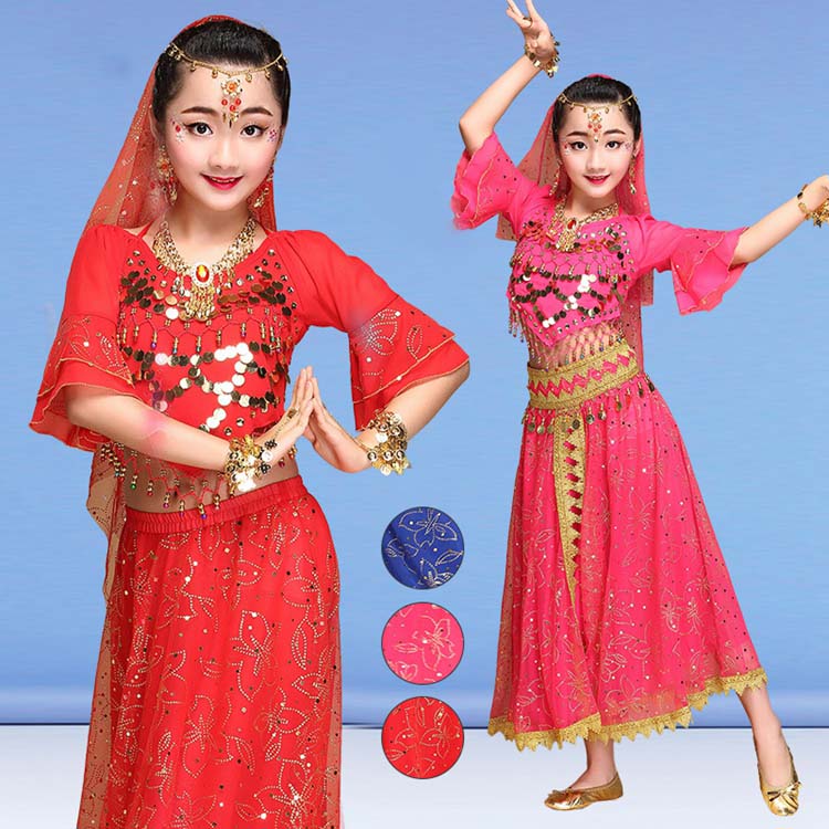 社交ダンス衣装 豪華セット 3色 ロングスカート 半袖ブラウス モダンドレス 子供ベリーダンス衣装 学園祭イベント演出ウエア スパンコール舞台演出ドレス 女の子舞台ダンスドレス