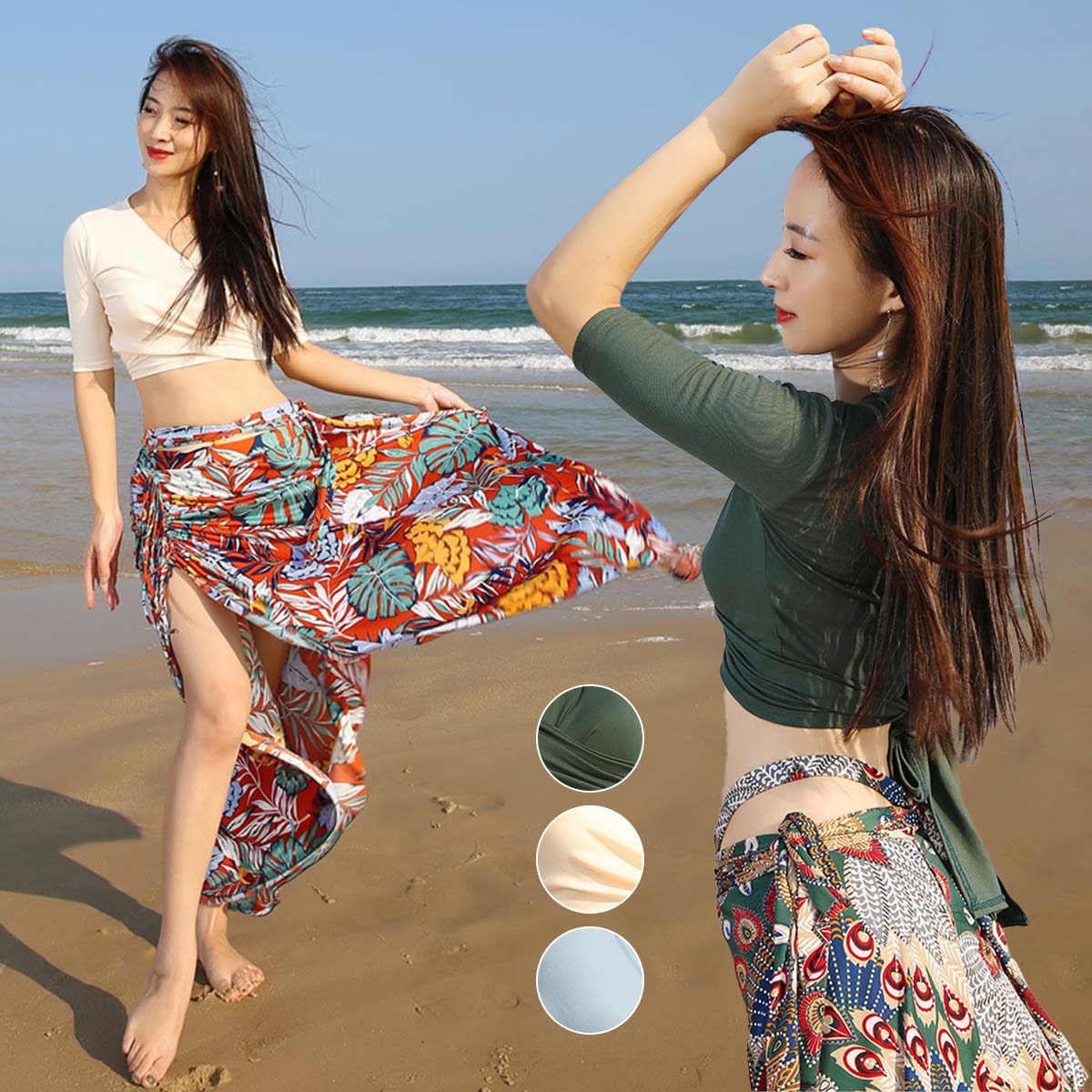 ボヘミアン風 衣装 民族風 ナチュラル セクシー 社交ダンス Belly 衣装 衣装 dance ショート丈 紐結ぶ スリット エスニック花柄 紐 半袖 ロングスカート 緑 レディース 新作