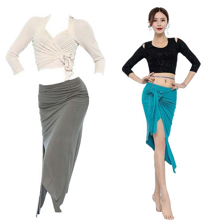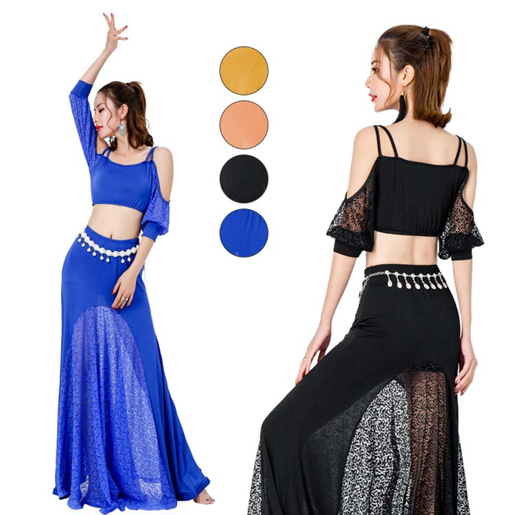 ストレッチ練習着 上下セットアップ セクシー舞台ステージ衣装 トップス+レース切替ロングスカート 社交ダンス衣装 ベルトチェーン対応可 ベリーダンス衣装 レッスンウエア