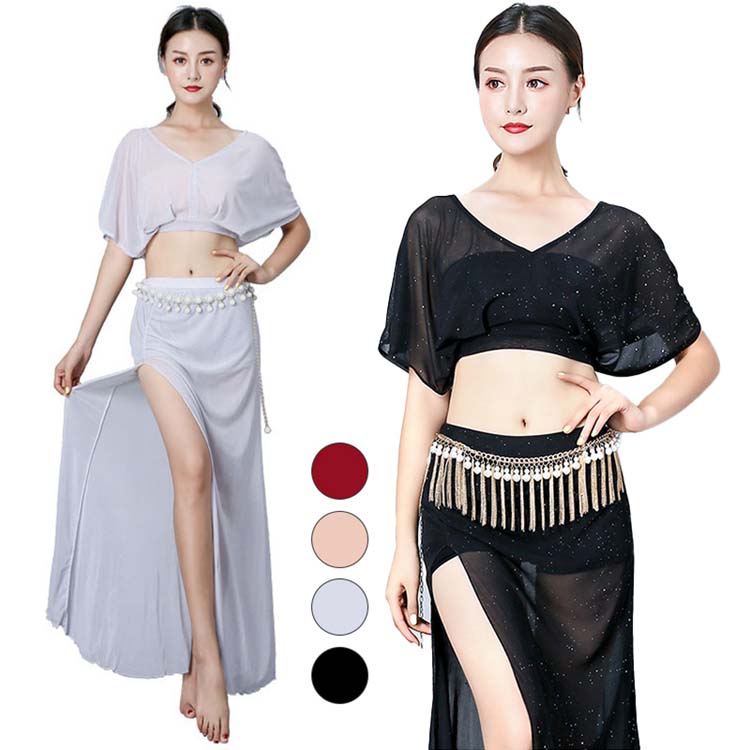 キラキラ レッスン着 セット 半袖 ロングスリットヒップスカーフ チェーンベルト対応可 ロングスカート 社交ダンスウエア ベリーダンス衣装 練習着 ミドリフへそ出し