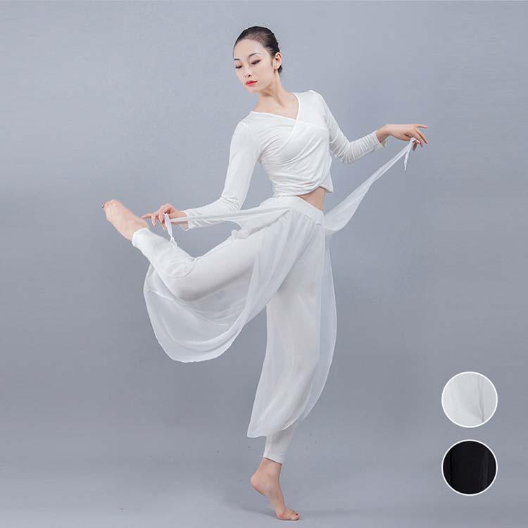 セット ヨガ 上下2点セット ホワイト 社交ダンス衣装 舞台ダンスレッスン着 ブラック シフォンサガウチョパンツ バレエ ダンス衣装 ラテン 古典ダンス 練習着 長袖Tシャツ 衣装