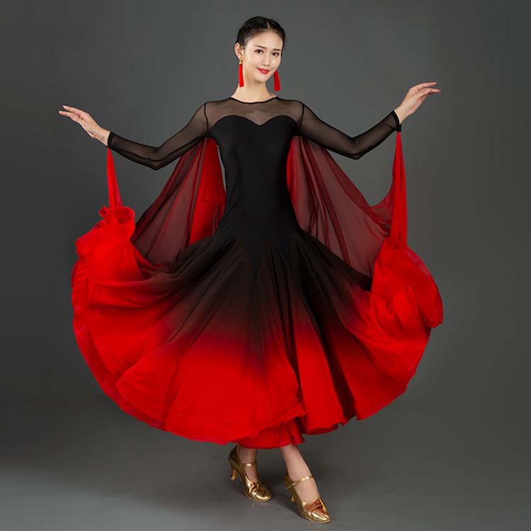 華やか リボン レディースダンス衣装 タンゴ ラテンダンス衣装 大きい裾ワタリ フラメンコ 練習 モダンドレス 赤黒グラデーションインターナショナル社交ダンス衣装 レッスン着