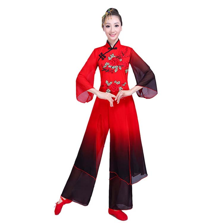 シフォンガウチョパンツ 上下2点セット チャイナ民族風ダンスウエア 飄逸な舞台ステジ衣装 配色 チャイナドレス 古典舞踊ダンス衣装 中華服 古典ダンスウエア 広袖ロングブラウス