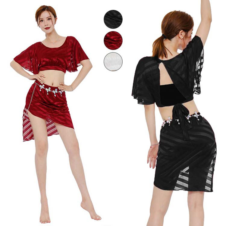 ワインレッド レッスン着 セットアップ 2点セット 不規則 白 ミニスカート 社交ダンスウエア レディースベリーダンス衣装 舞台ステージ衣装 インナーパンツ付 バックレスダンス練習着