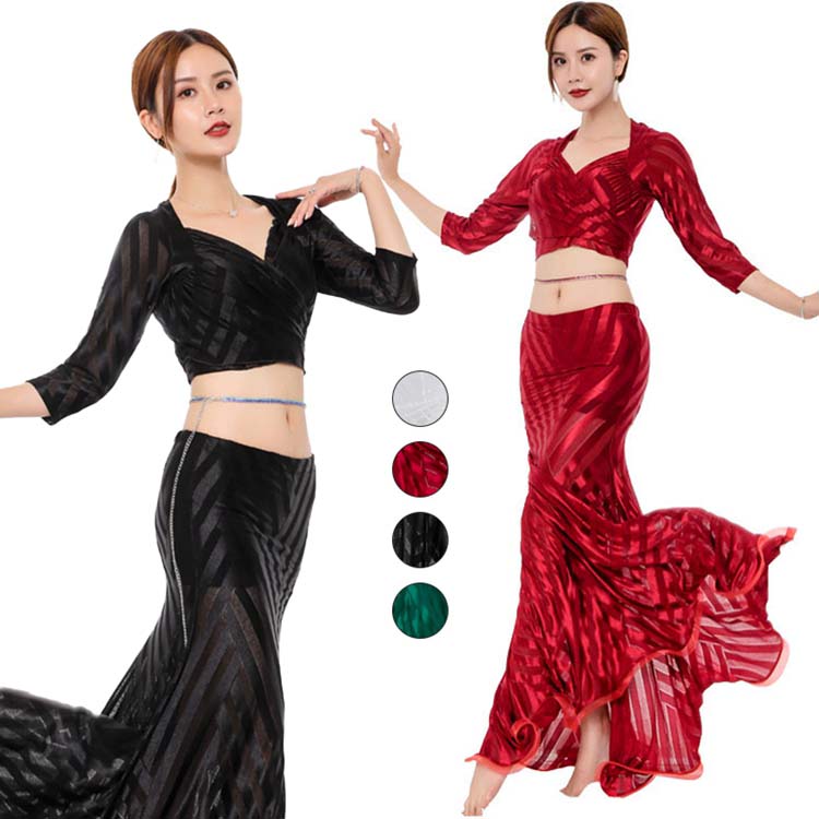 レッスンウエア 上下セットアップ 秋冬新作ダンス衣装 美ライン 七分袖へそ出しトップス+ロングマーメイドスカート ベリーダンス衣装 ラテン古典ダンス衣装 透け感あり練習着