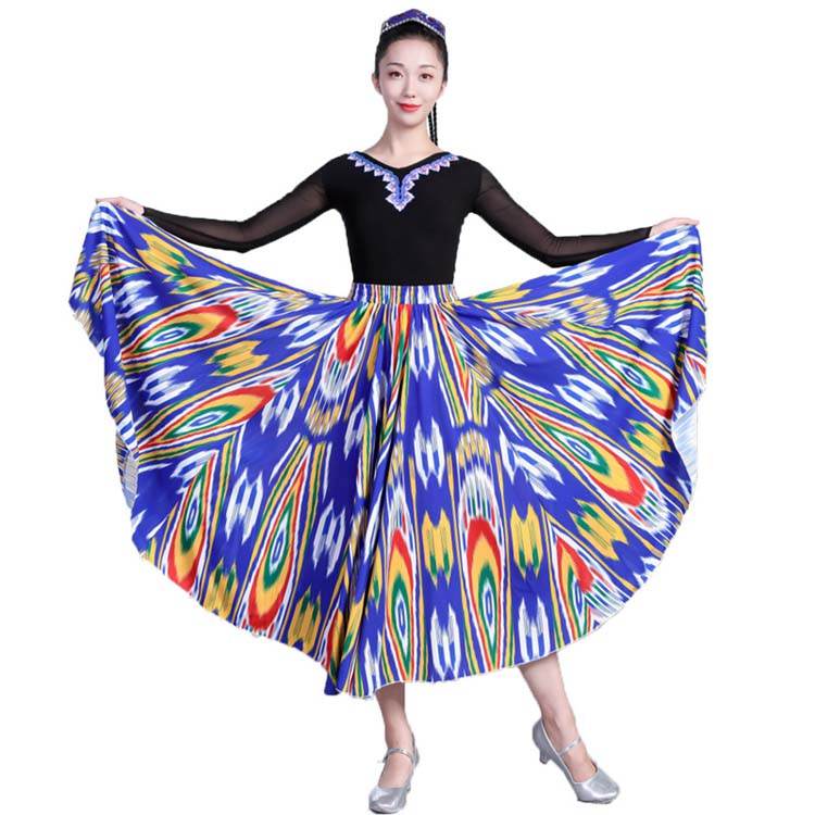 広がる エスニック柄 孔雀 540度 ブルー 大きい裾 サーキュラースカート ダンス練習着 ロングスカート レッスンウェア 社交ダンス 裾幅360度 エレガント 丈85 スカート