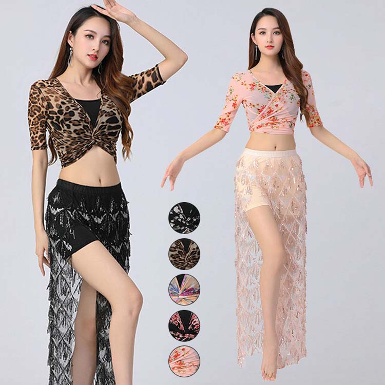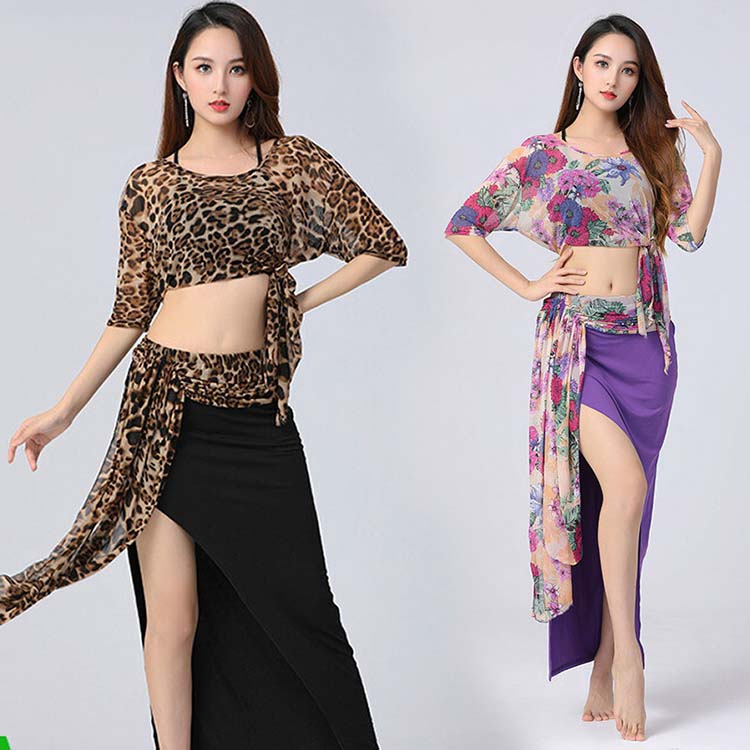 新作 社交ダンス リボン結ぶブラウス 黒花 紫花 Belly ヒョウ柄 セットアップ Dance ドルマン 豹柄 セクシー スリットスカート 柄リボンスカーフ 半袖 不規則裾 練習着 大人