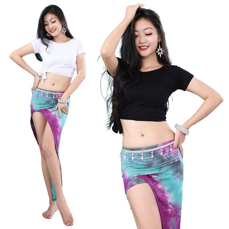 社交ダンス 半袖 セクシー 夏新作 黒 練習着 白 衣装2点セット レッスンウェア 裾リボン ロングスカート 練習ウェア ラテンダンス Belly アシンメトリー裾 ストレッチ ショート丈