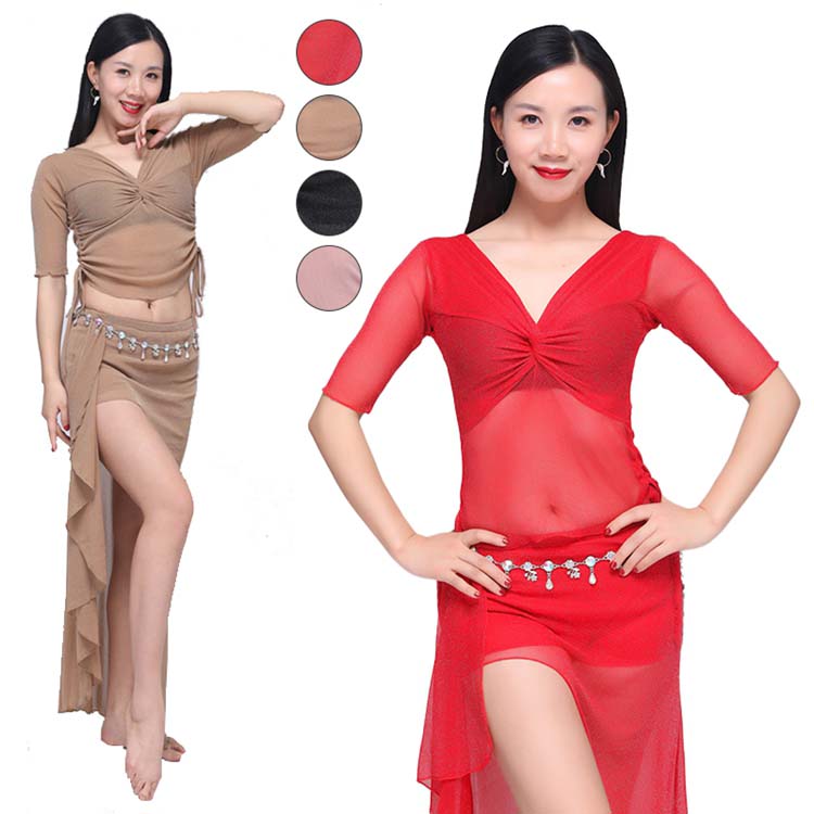 半袖 Vネック Belly レッスン着ステージ衣装 ピンク 大人 トップス 緑 衣装セット ロングスカート スパンコール スカート 練習着 dance ラテン ブラウス セクシー M~3XL 花柄 前