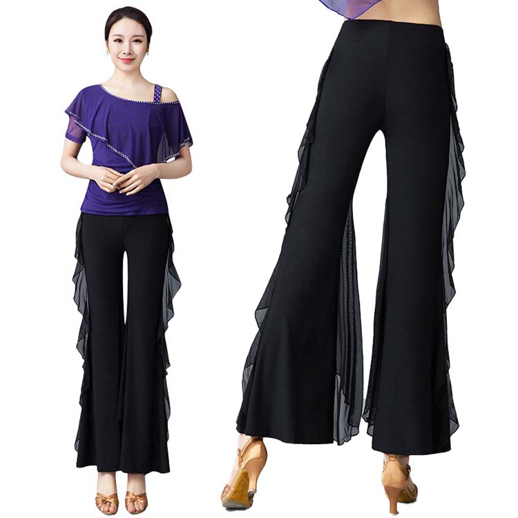 衣装練習着 ラッパパンツ レディース社交ダンス衣装 競技着 ボトムス ブラック ドレープ レッスン着 リボン モダン ラテンダンスパンツ スリット タップダンス フレアパンツ