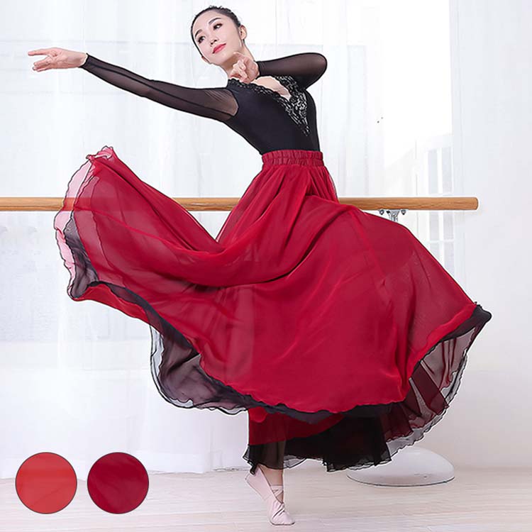 大きい裾 スカート 練習着 黒+赤80CM 85CM 広がる 90CM スカート ロング丈 フラメンコ スカート 黒+ワインレッド レッスン着 飄逸 民族ダンス ダンス レディース 色違いシフォン