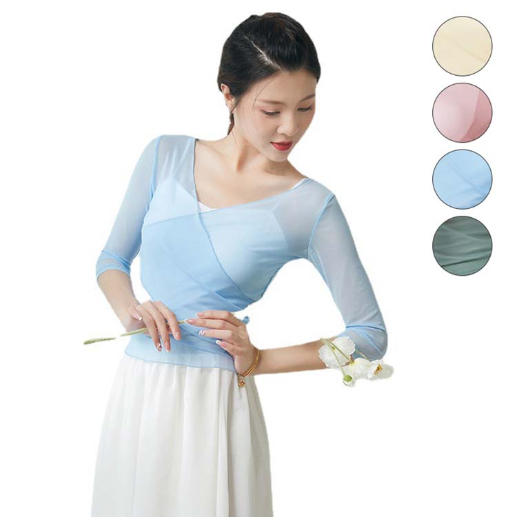 クラシカル Vネック 衣装 舞台衣装 演出服 ダンス衣装 黄 トップス 五分袖 シースルー 古典ダンス 無地 練習着 レッスンウェア 紗 モダンダンス シャツ レディース ブラウス