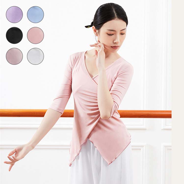 レディース Vネック 練習着 春夏新作 黒 ピンク 五分袖 紫 衣装 シャツ バレエ 社交ダンス ダンスウェア レッスン着 大人 エレガント ベリーダンス アシンメトリー トップス