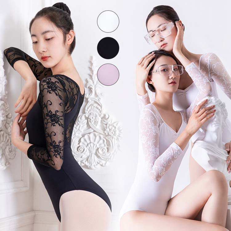 七分袖 エレガント 空中ヨガ 胸パッドポケットブラック ラベンダー 袖と背中 レオタード レース レオタード レッスン着 花柄 バレエ用品 おしゃれ 可愛い 体操 2