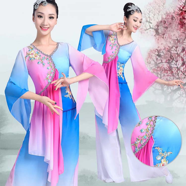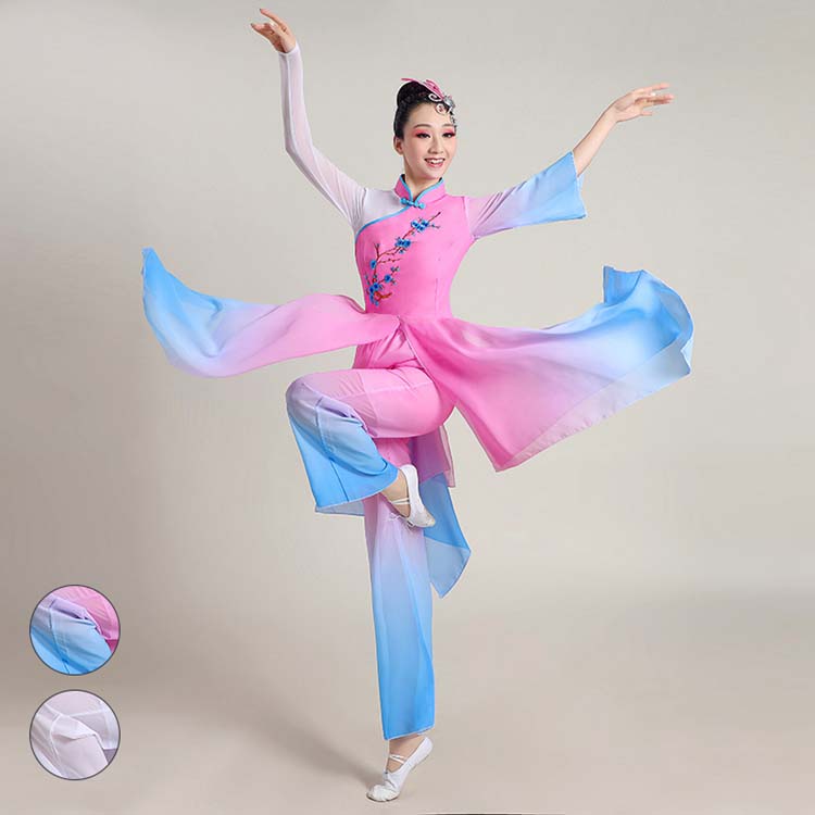 民族ダンス 大人 演出衣装 花刺しゅう ~3 衣装セット チャイナ風 レディース スリット ひらひら 配色 ガウチョパンツ エレガント 不規則裾 モダン ロング丈ブラウス 古典踊り