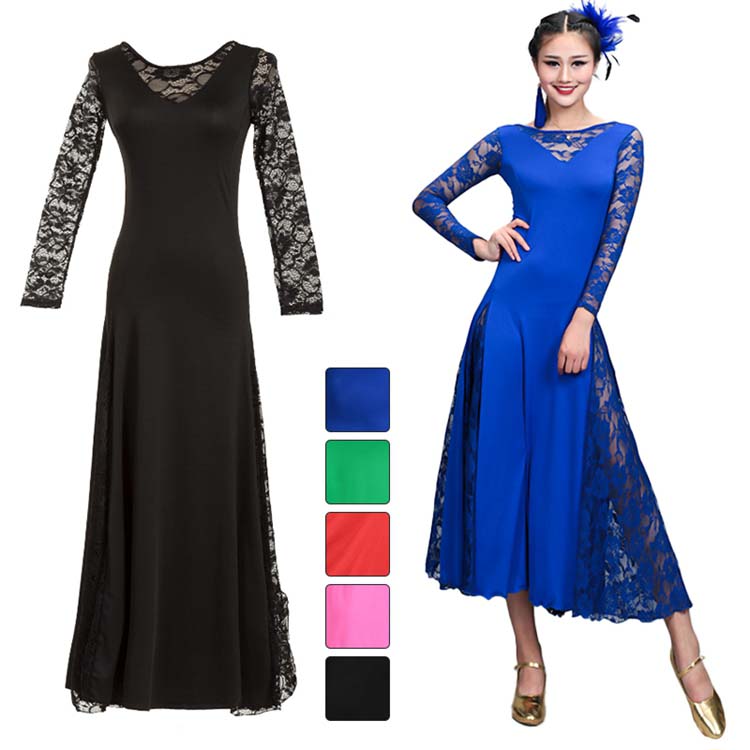 レッスンウェア ワンピース 黒 ダンス練習着 衣装 ラテンドレス フレア 発表会ミュージカル舞台ステージ 赤 ロングダンスワンピース ブルー ストレッチ レース ピンク 長袖